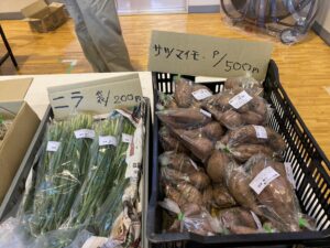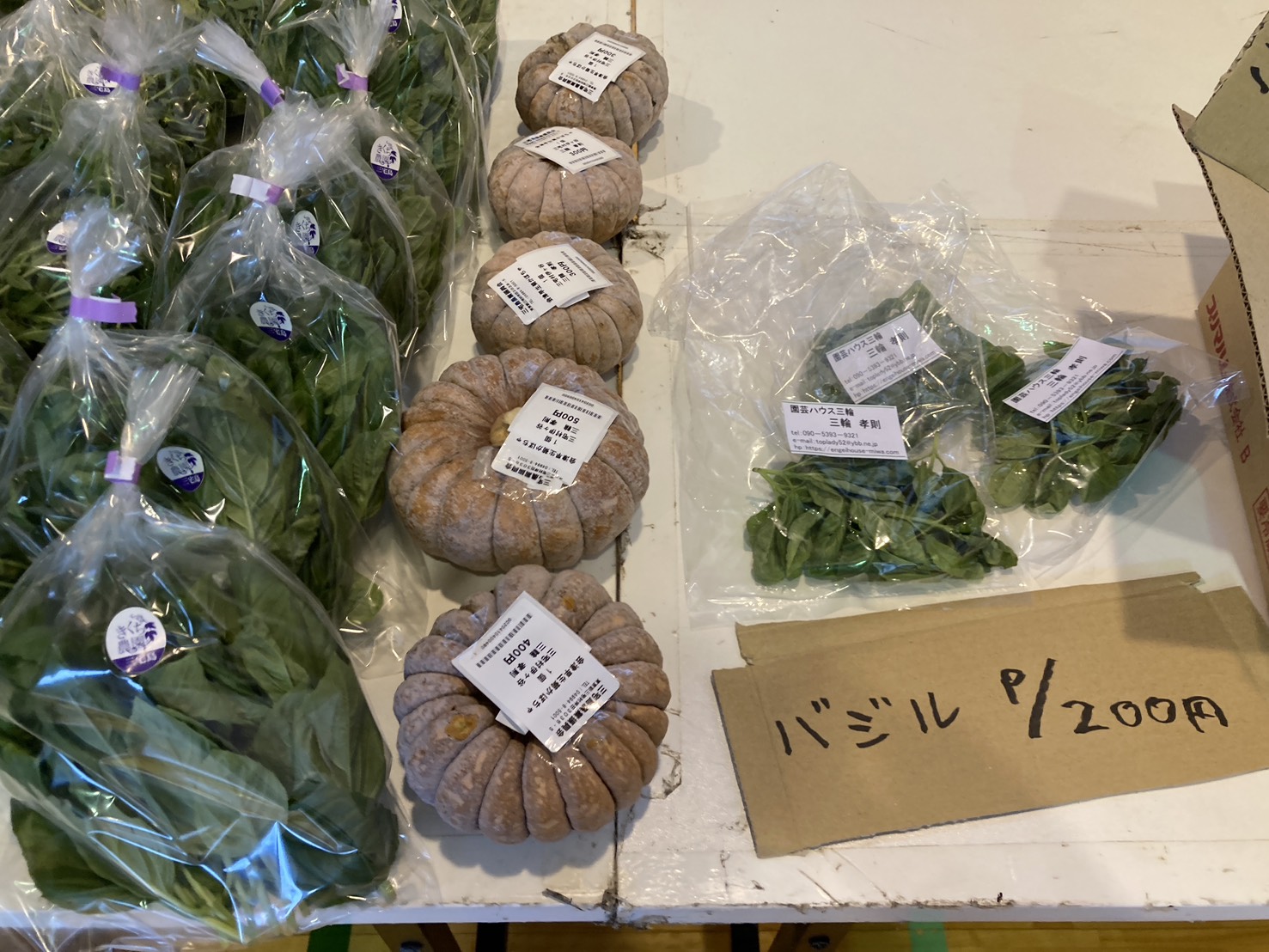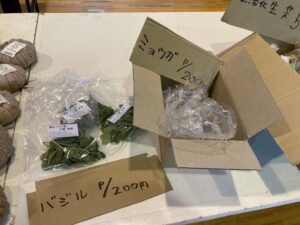 ニラ、サツマイモ、ミョウガ、生落花生、カボチャ、バジルを販売しています。